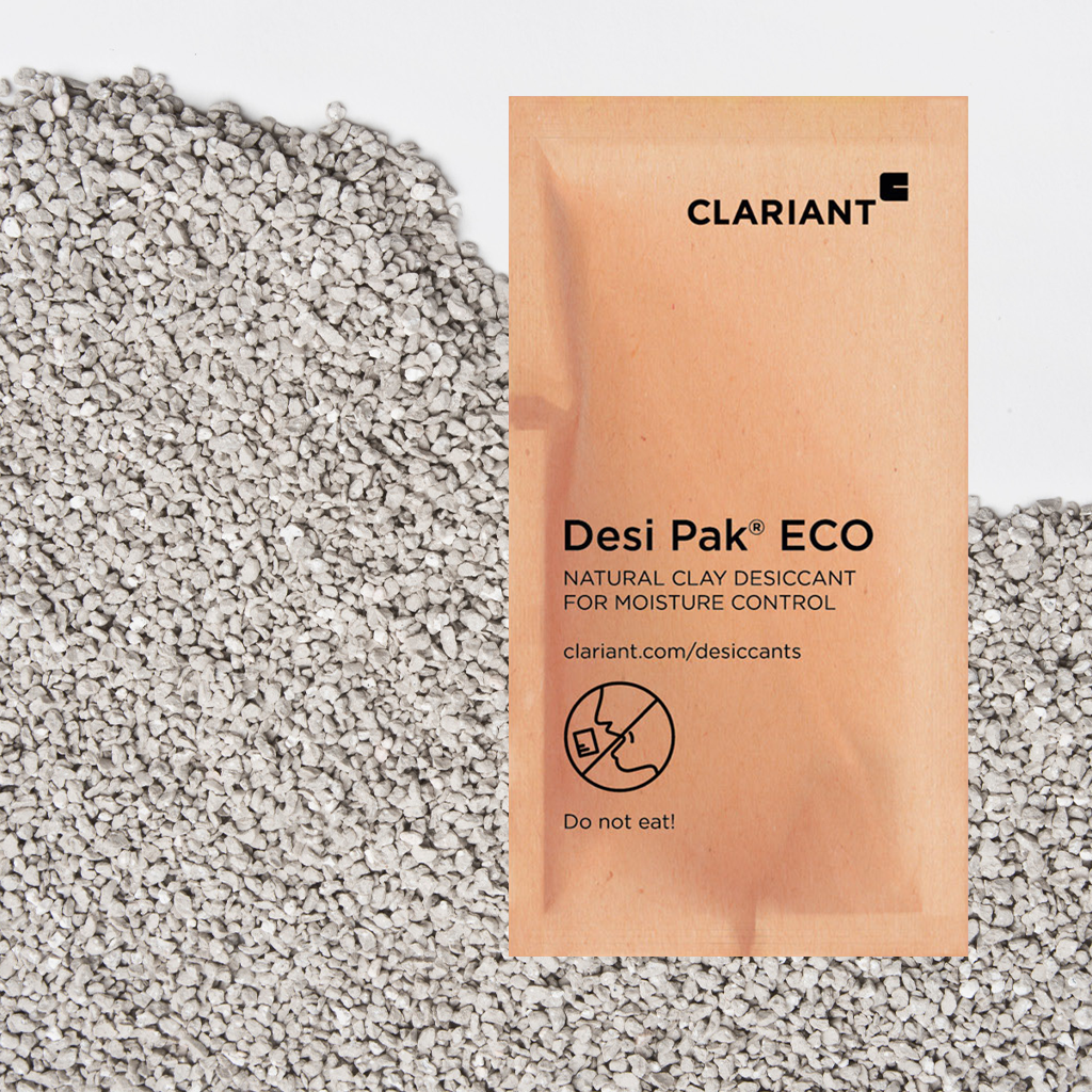 The Desi Pak® ECO desiccant offers a sustainable moisture-control solution made from responsibly mined bentonite clay and housed in a plastic-free, bio-based paper sachet.